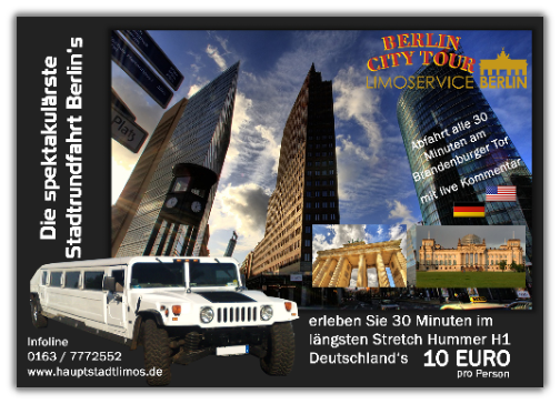 Die spektakulärste Stadtrundfahrt Berlin´s. Erleben Sie ca. 35 min in einzigen Hummer H1 Stretchlimousine Deutschlands zum Preis von nur 10,- Euro pro Person. Die Abfahrt und das Ende ist am Brandenburger Tor. Auf der Tour werden Sie ca 22 Sehenswürdigkeiten sehen und diese live kommentiert bekommen.